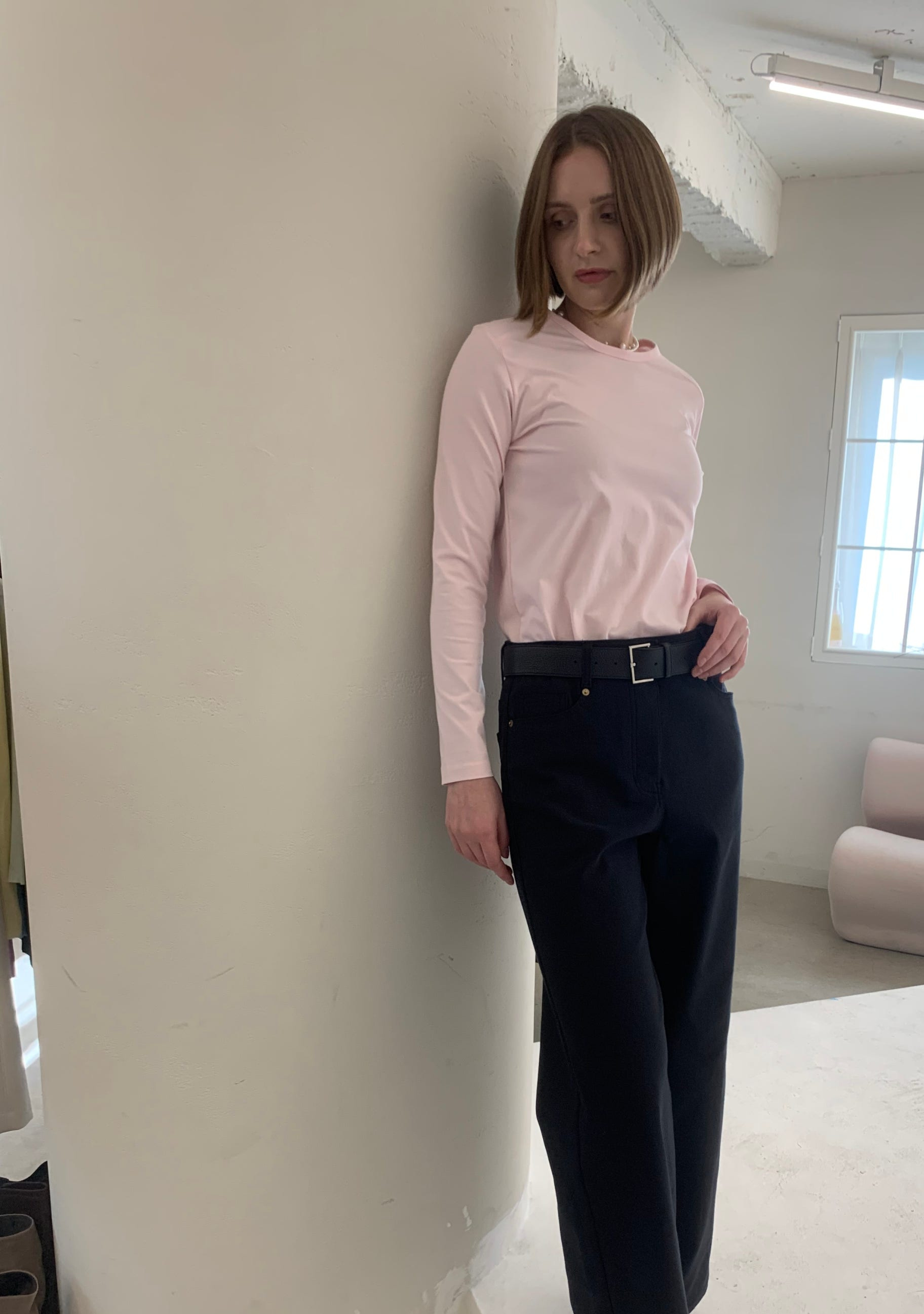 모던한 크루넥 슬림핏 티셔츠입니다.