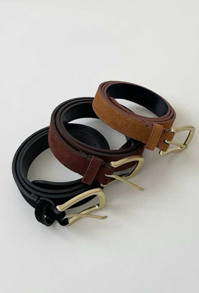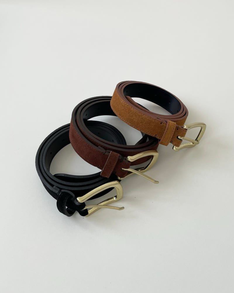 천연 스웨드 소가죽 특유의 고급스러움과 은은한 골드 버클이 세련된 무드를 선사합니다.