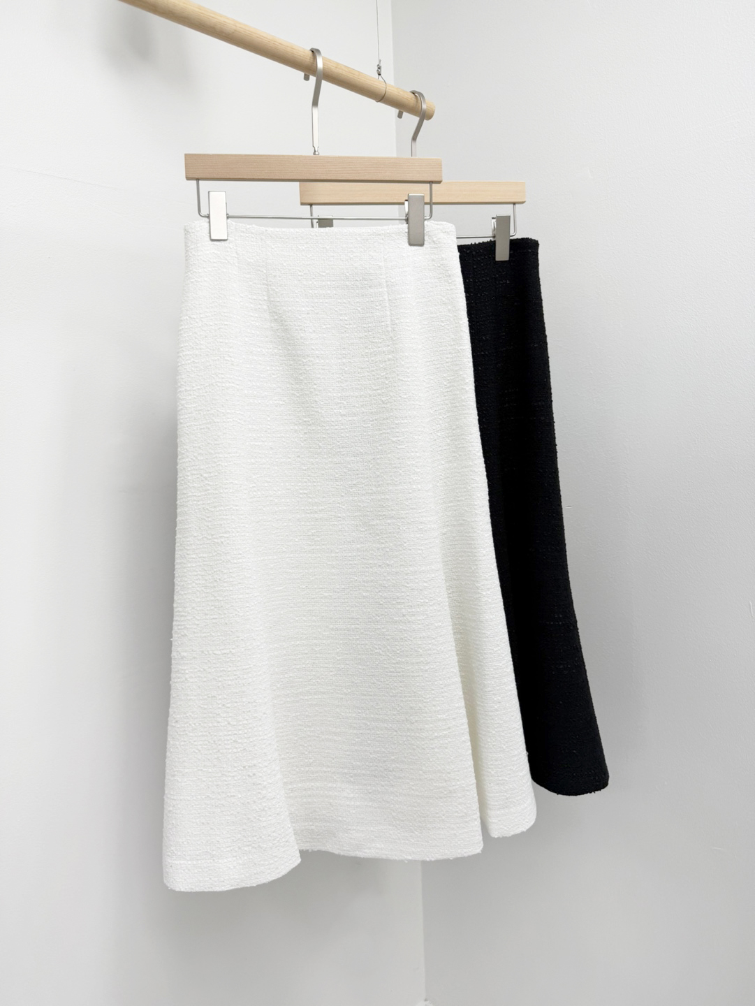 트위드자켓과 동일한 소재로 제작한 미디기장의 플레어스커트 입니다.