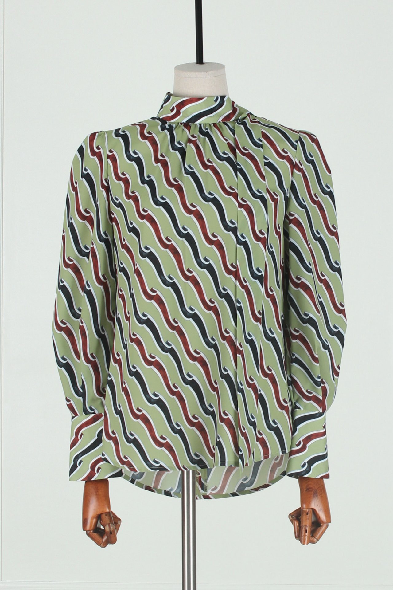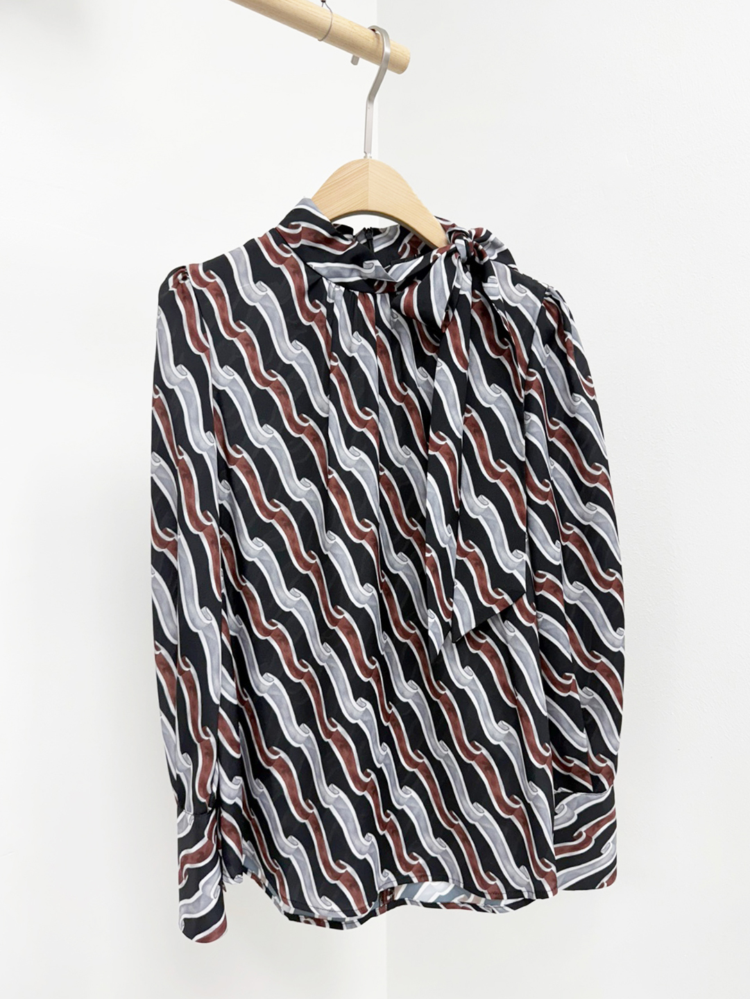 서로 다른 컬러 블록과 규칙적인 엠블럼 패턴이 조화를 이루는 블라우스입니다.