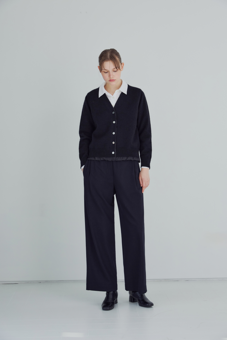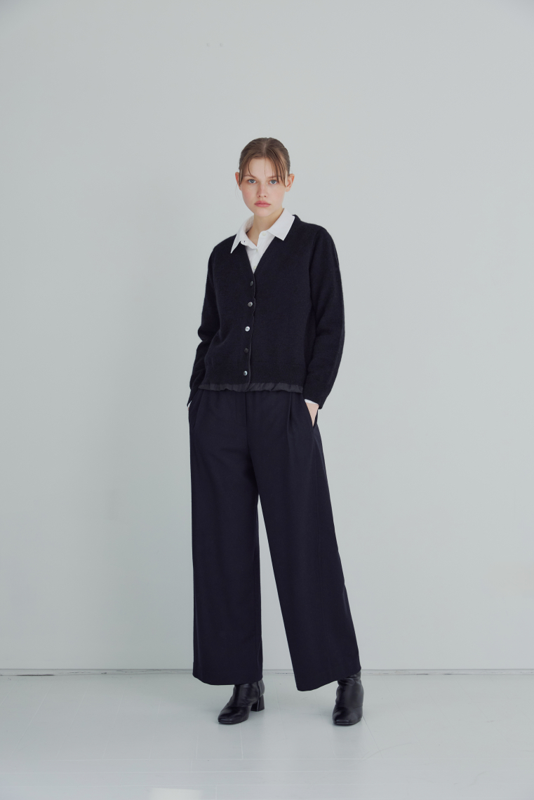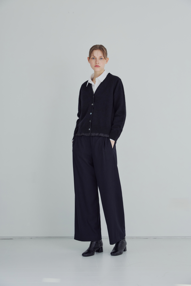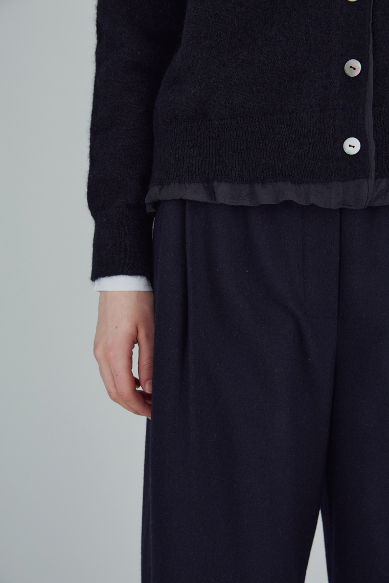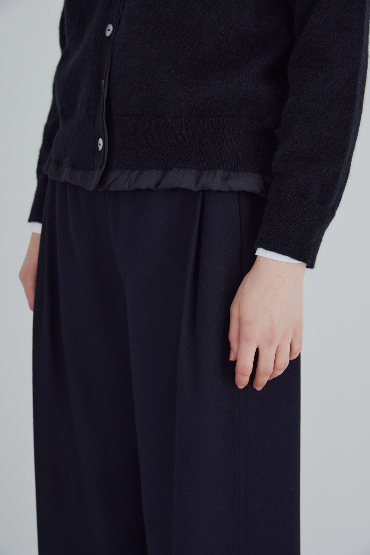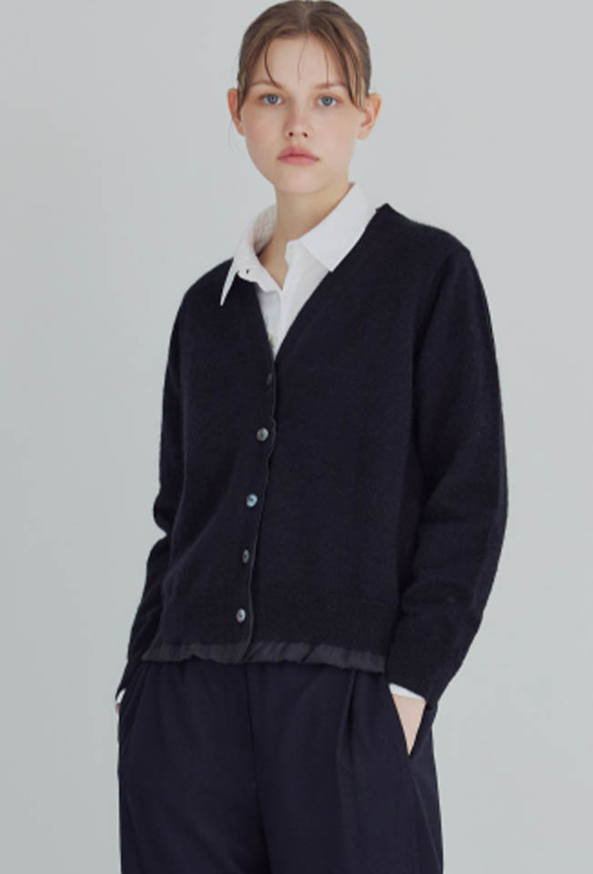 우븐소재를 안감으로 넣고 밑단에 자연스럽게 배색처럼 보이도록한 디자인이 유니크한 니트 가디건입니다.