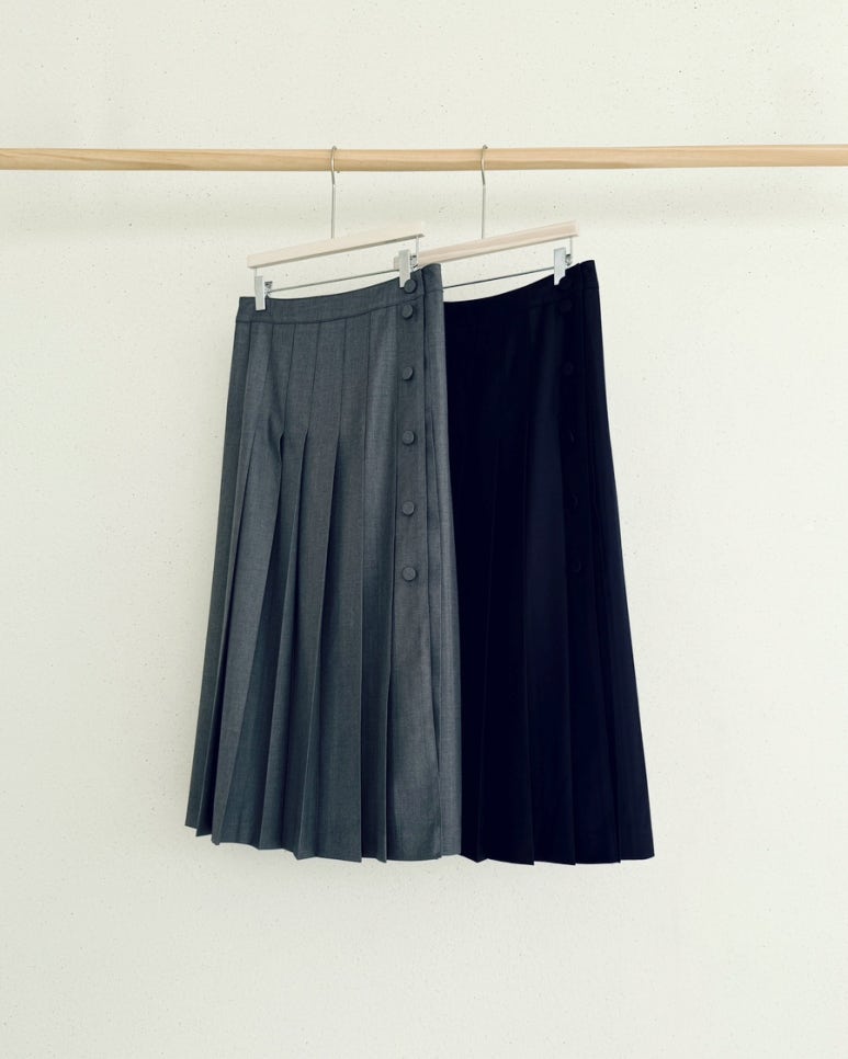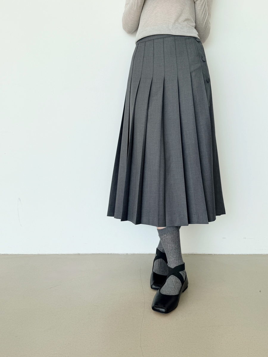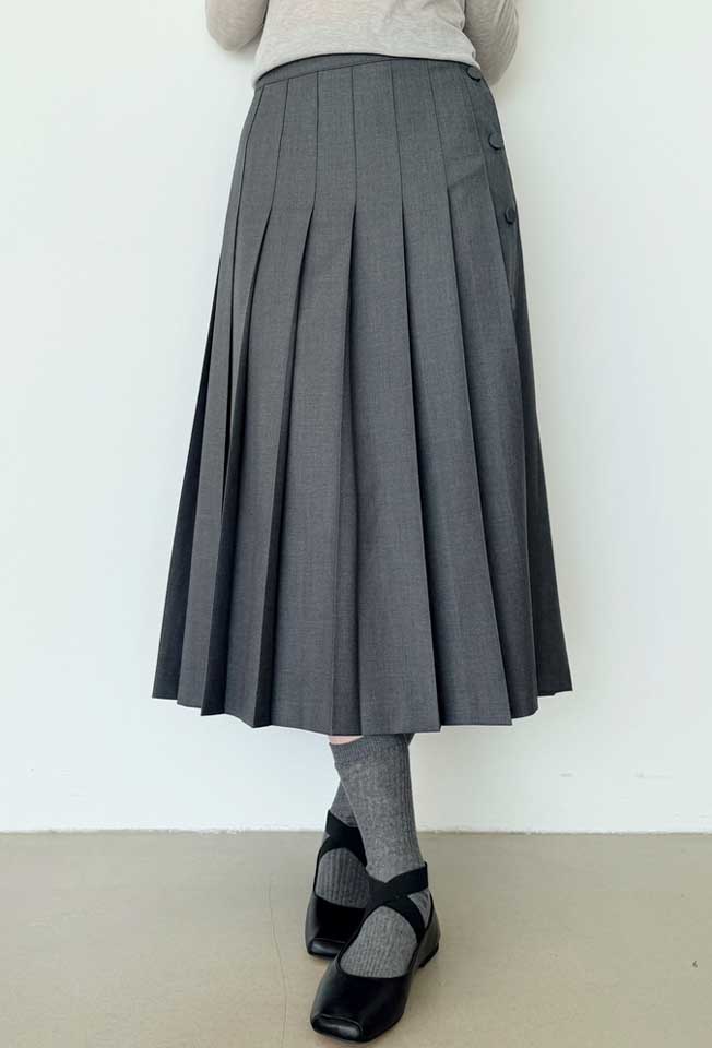 언발란스 오픈 라인의 버른 디테일이 매력적인 플리츠 미디스커트입니다.