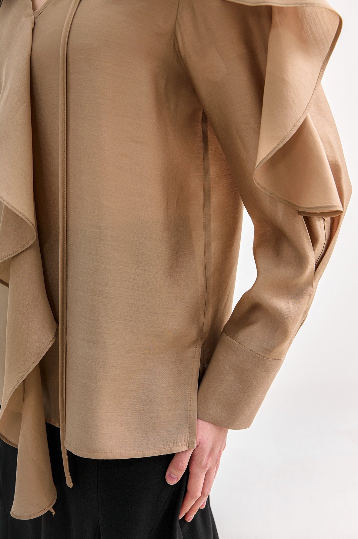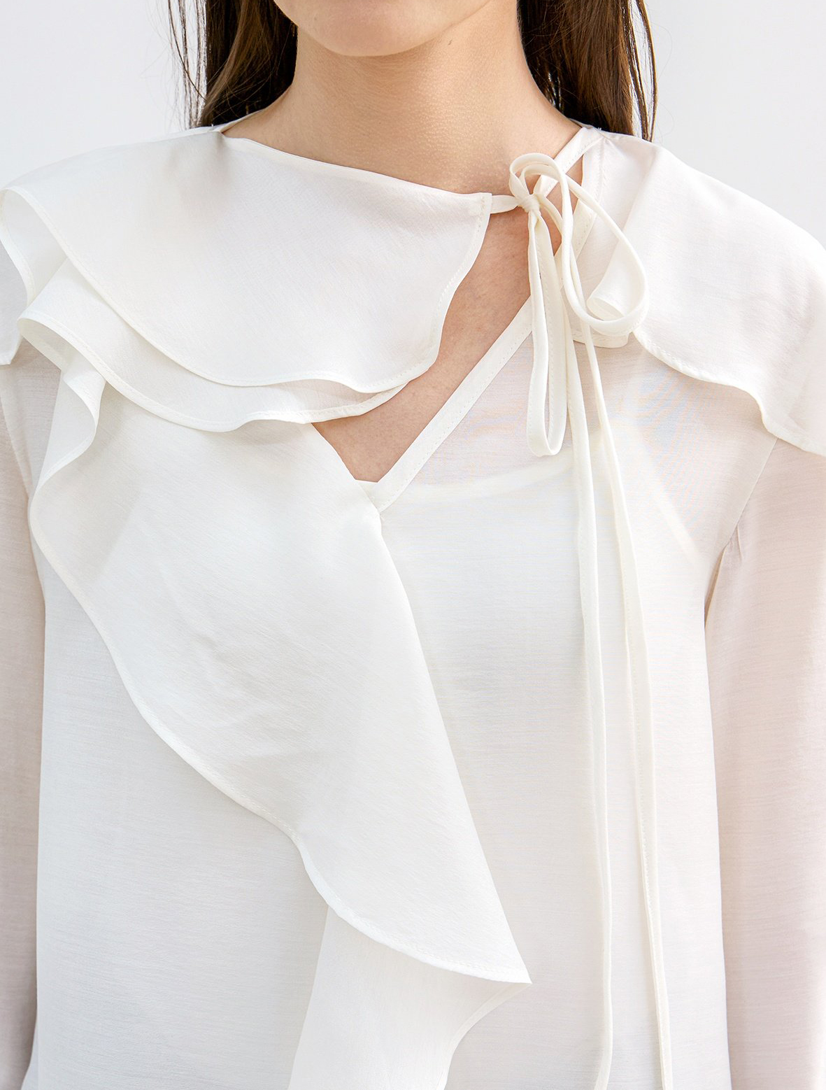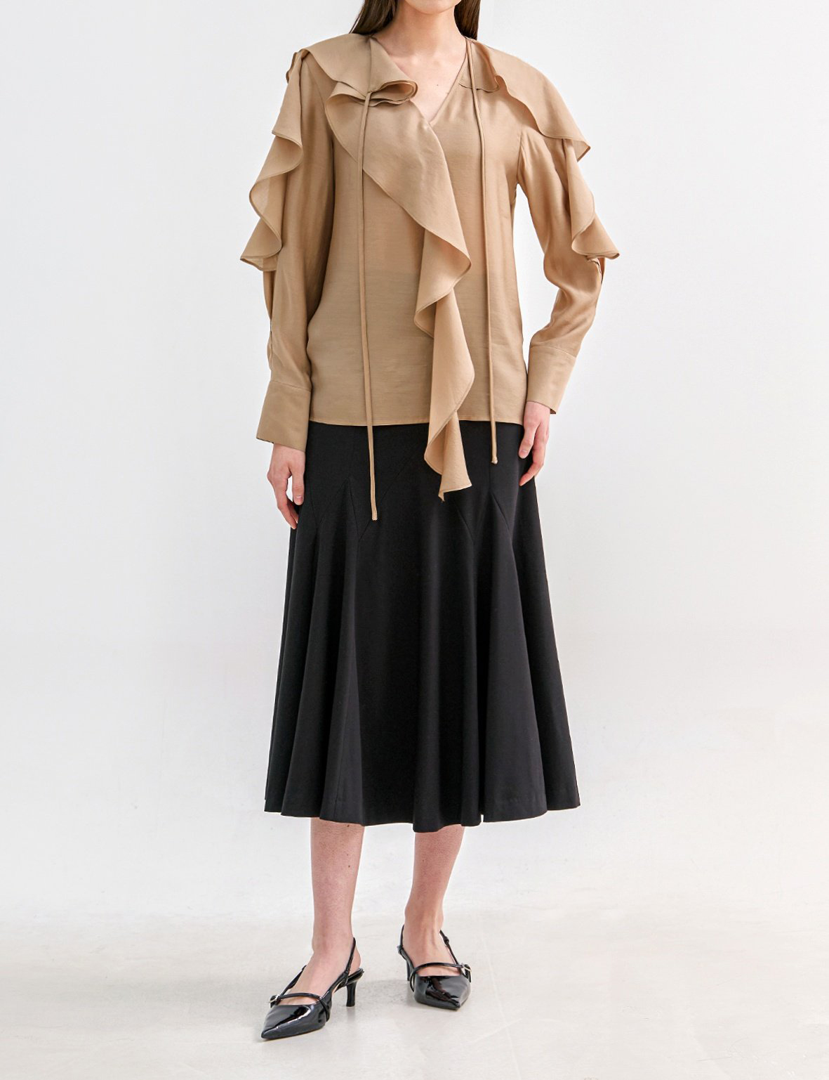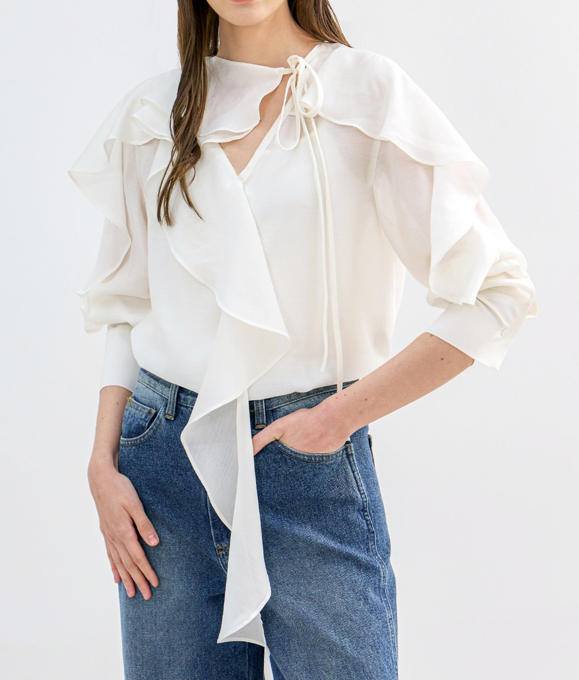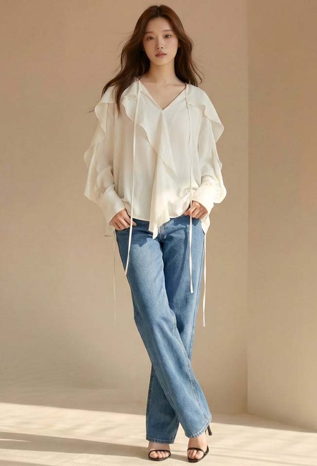 네크에서 소매로 이어지는 입체적인 러플 디테일이 자연스러운 볼륨을 연출하며 옷을 한층 리듬감 있게 표현합니다.