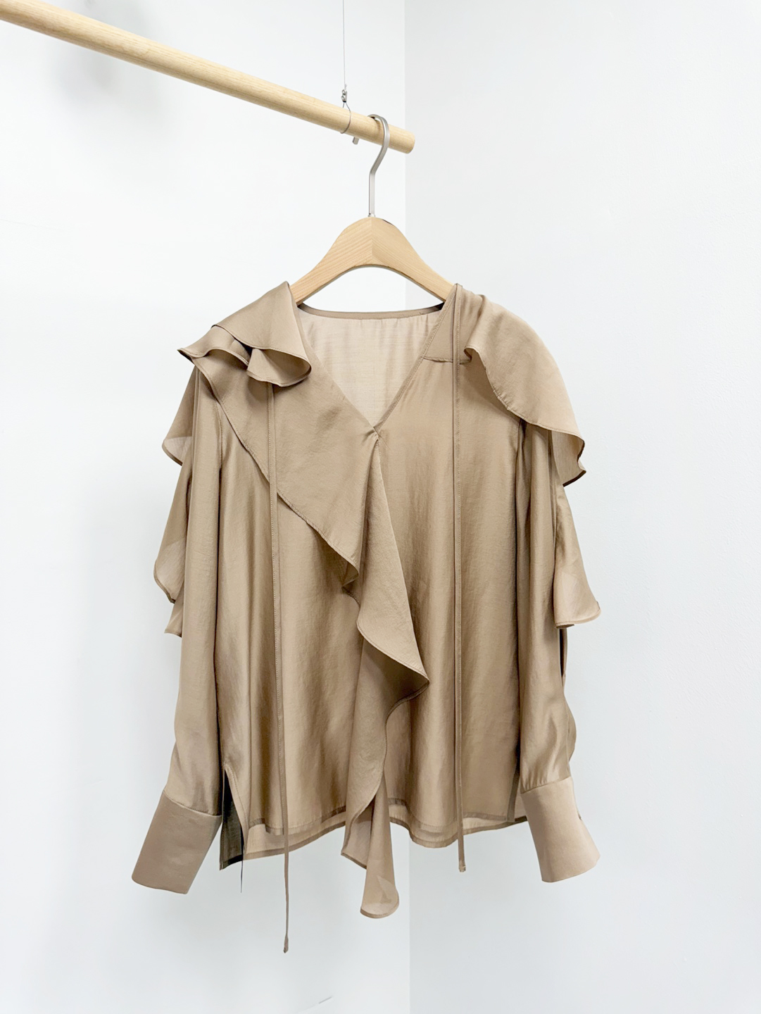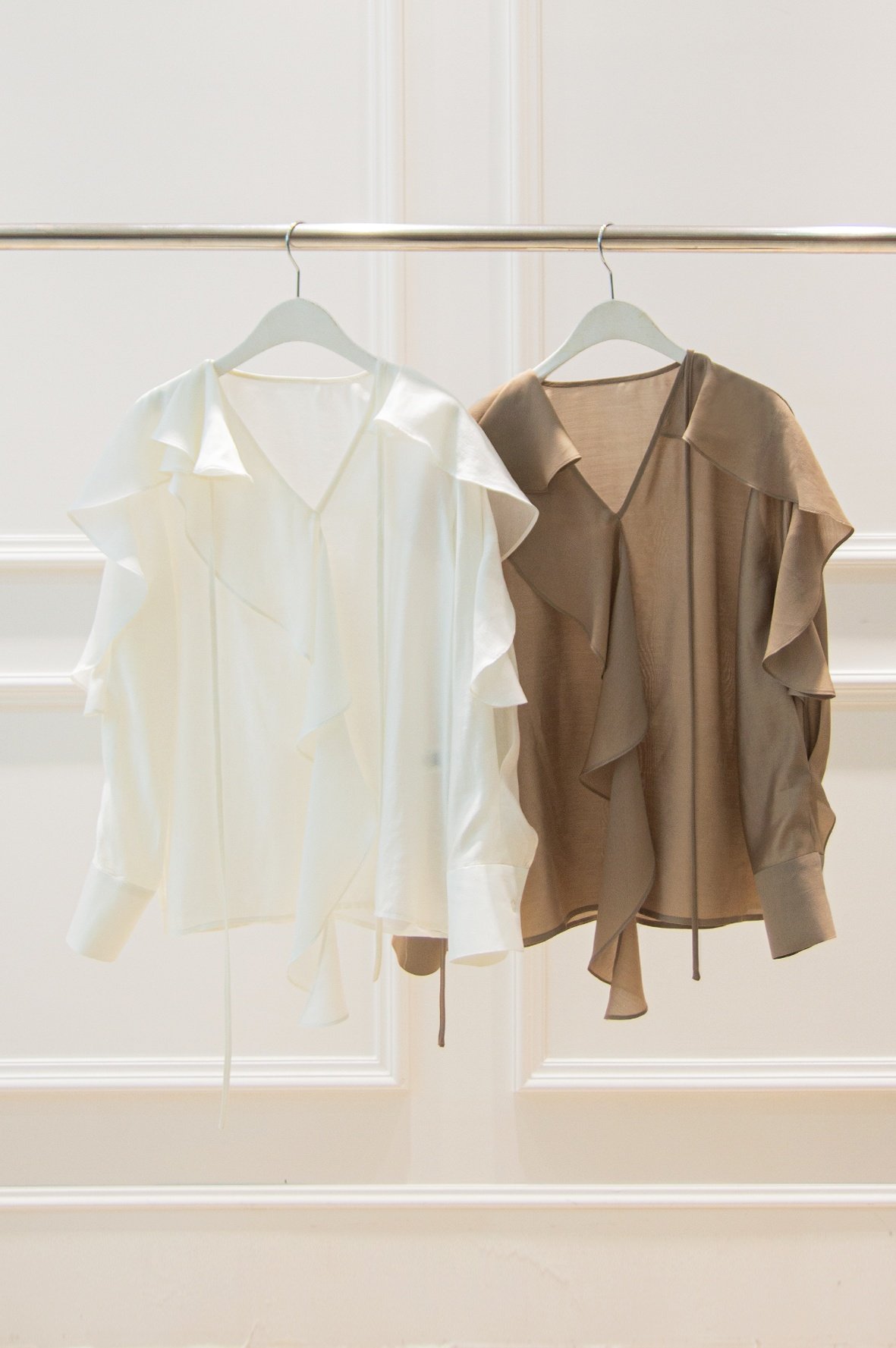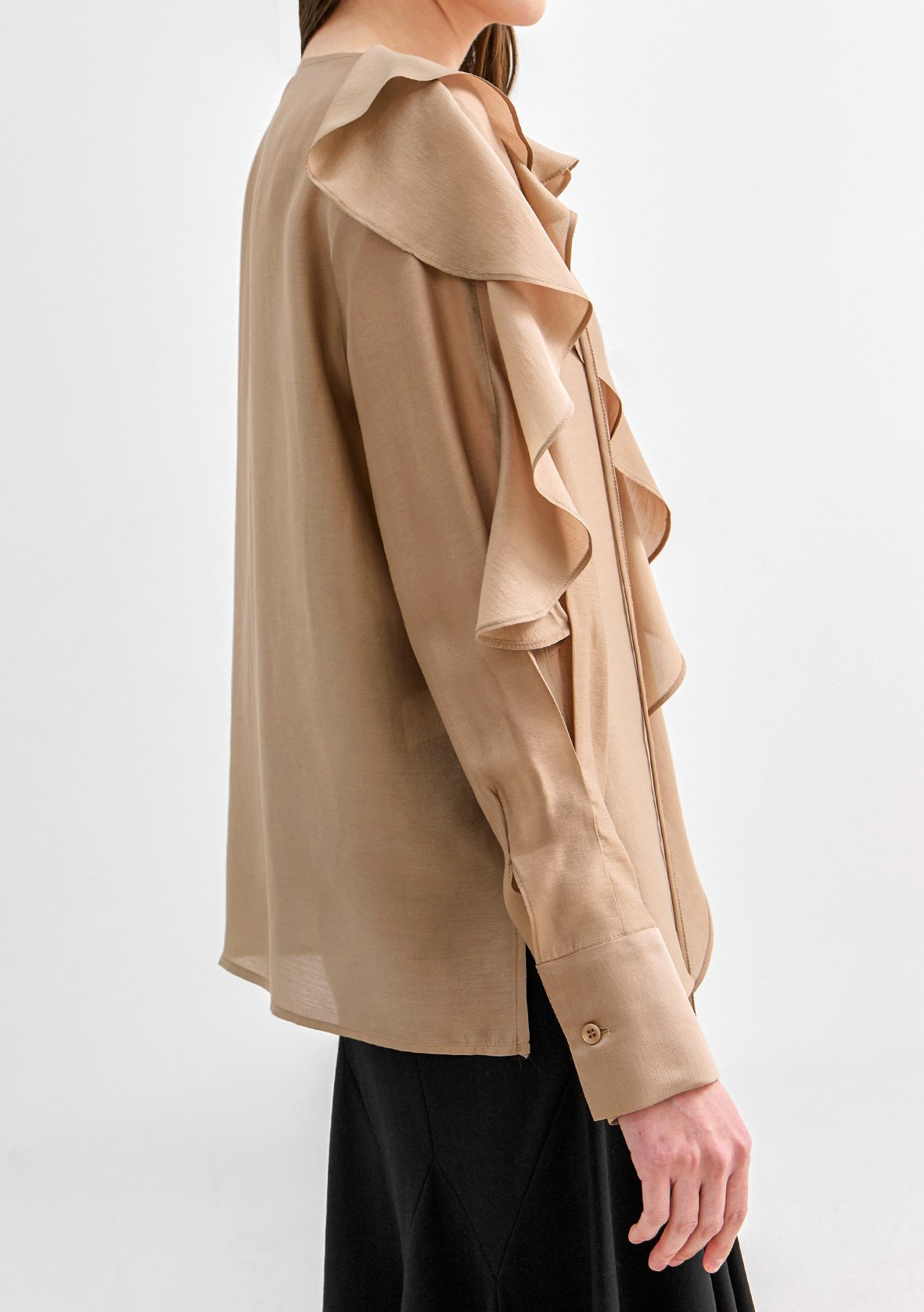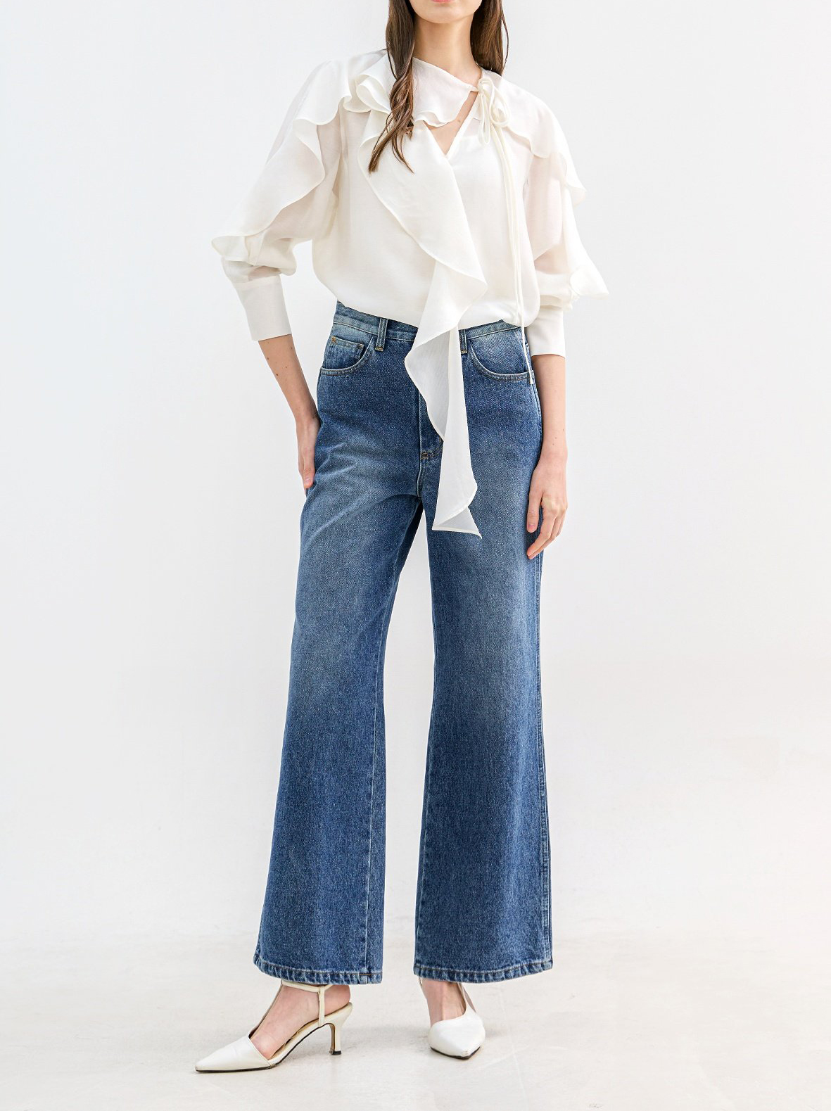 네크에서 소매로 이어지는 입체적인 러플 디테일이 자연스러운 볼륨을 연출하며 옷을 한층 리듬감 있게 표현합니다.