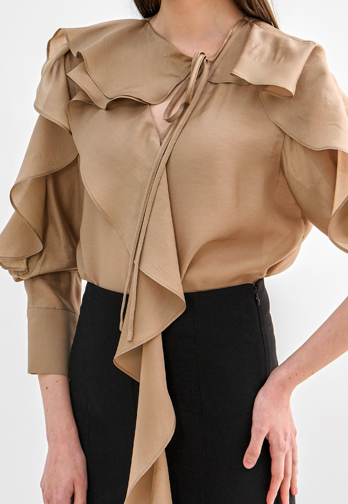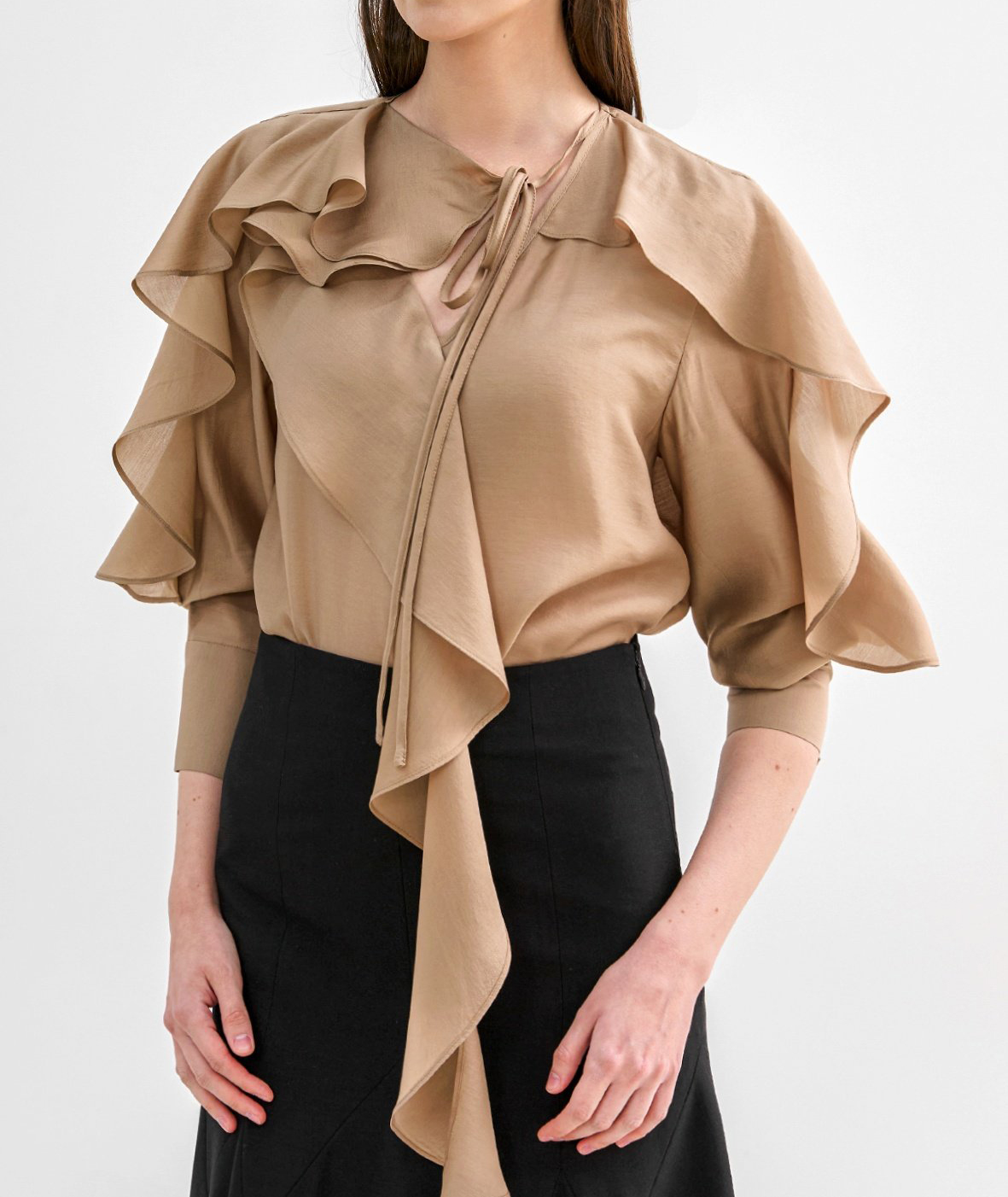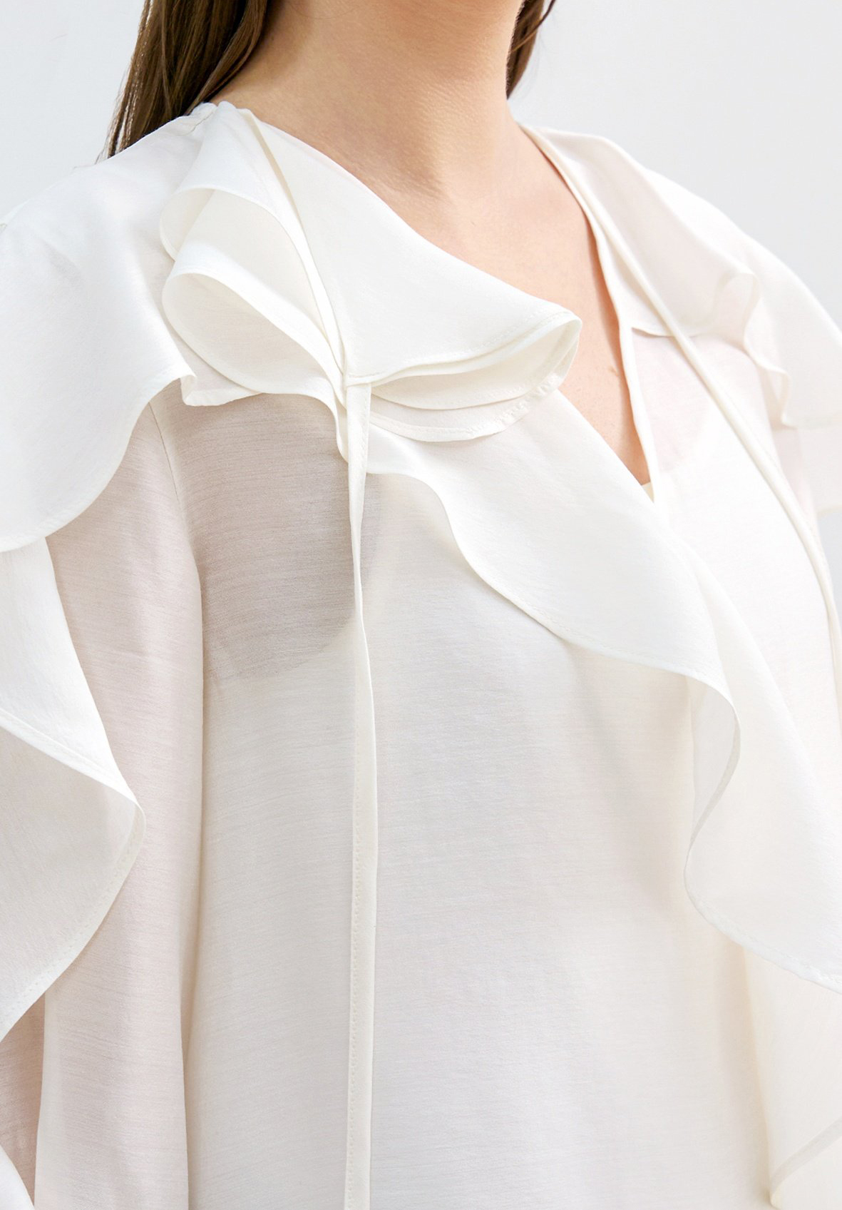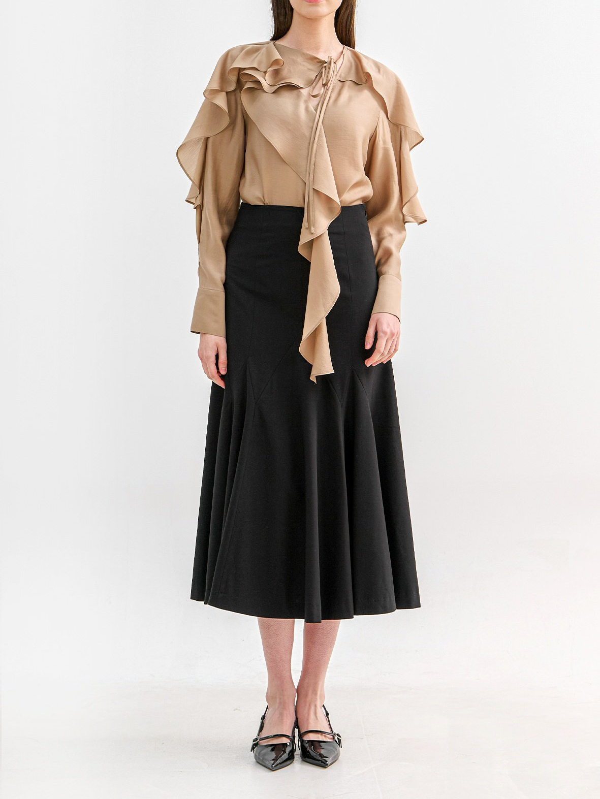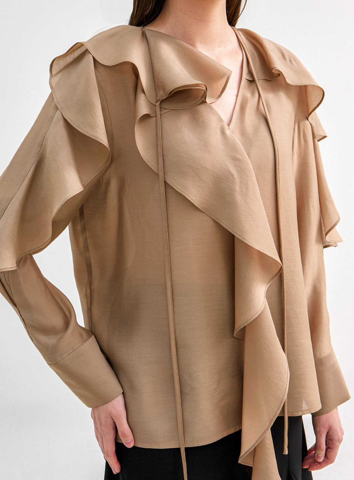 네크에서 소매로 이어지는 입체적인 러플 디테일이 자연스러운 볼륨을 연출하며 옷을 한층 리듬감 있게 표현합니다.