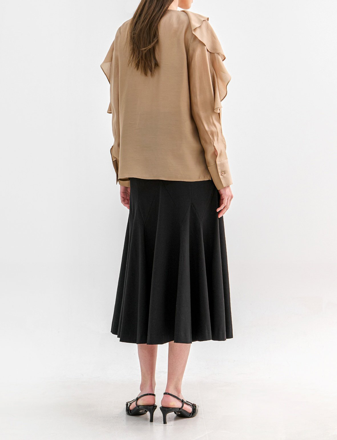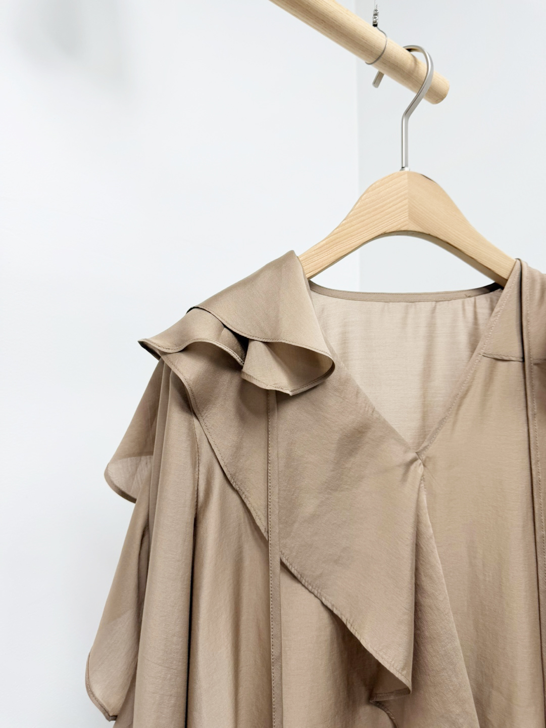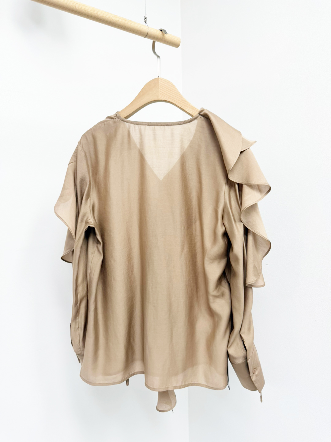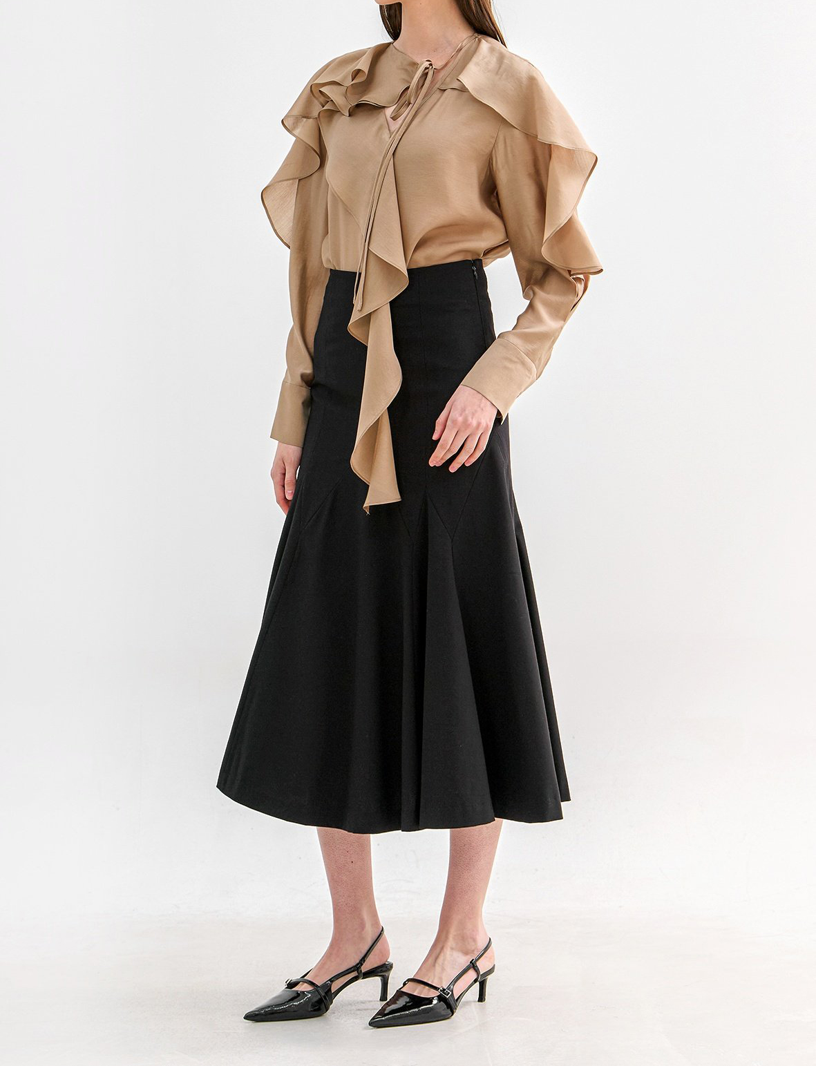 네크에서 소매로 이어지는 입체적인 러플 디테일이 자연스러운 볼륨을 연출하며 옷을 한층 리듬감 있게 표현합니다.