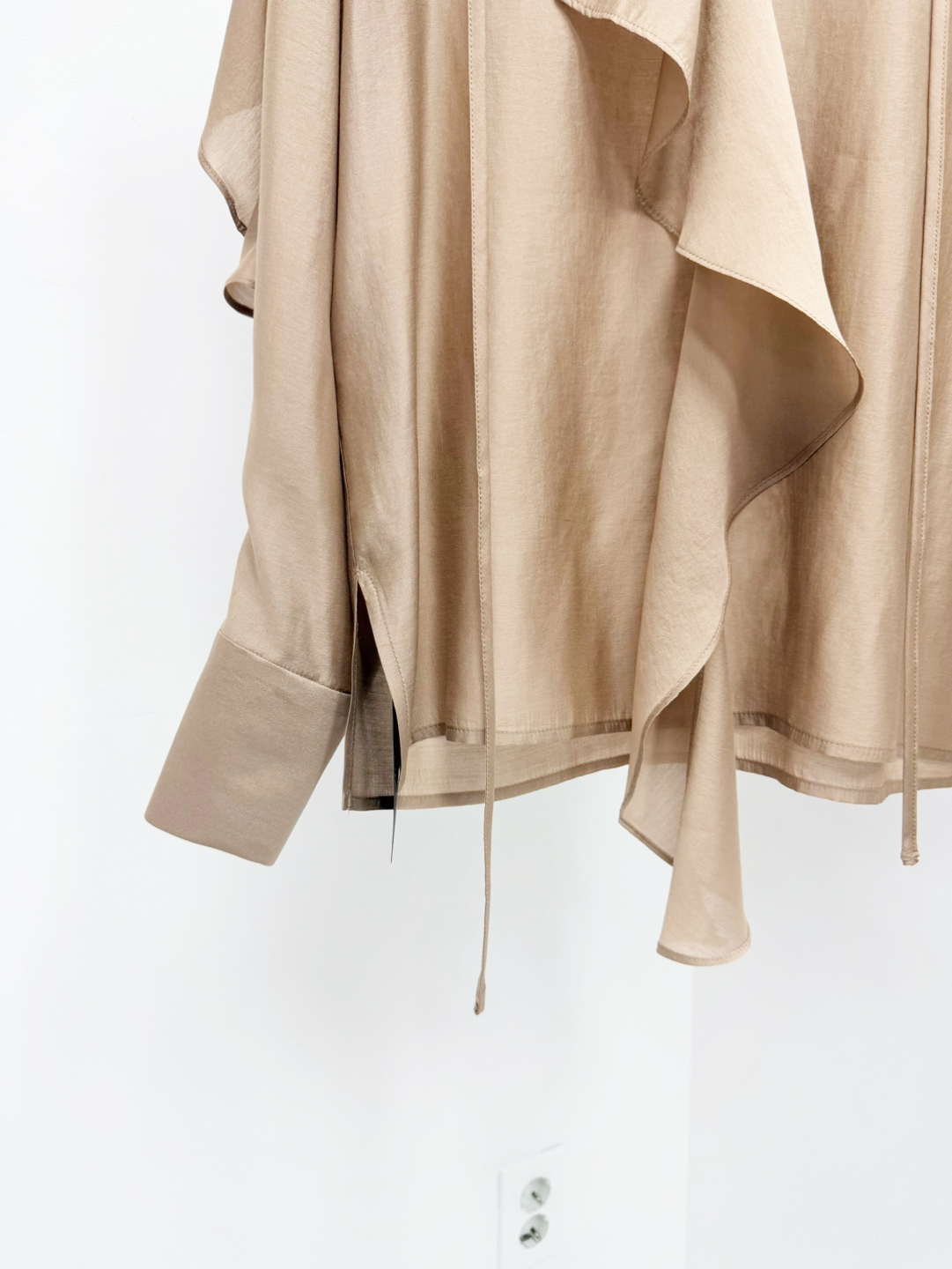 브이넥 라인에 자연스럽게 연결된 스트랩으로 묶거나 늘어뜨려 다양한 스타일링이 가능합니다.