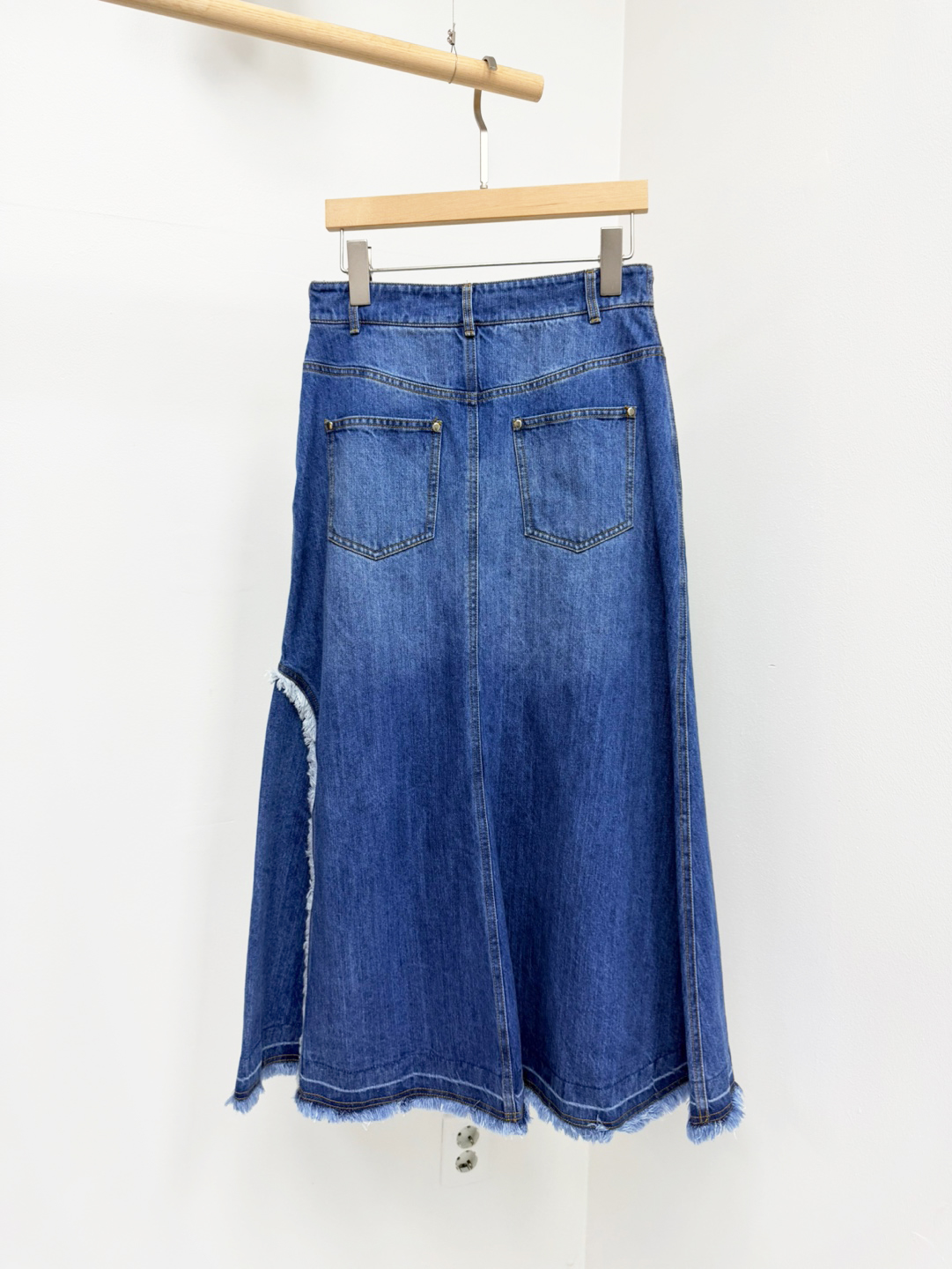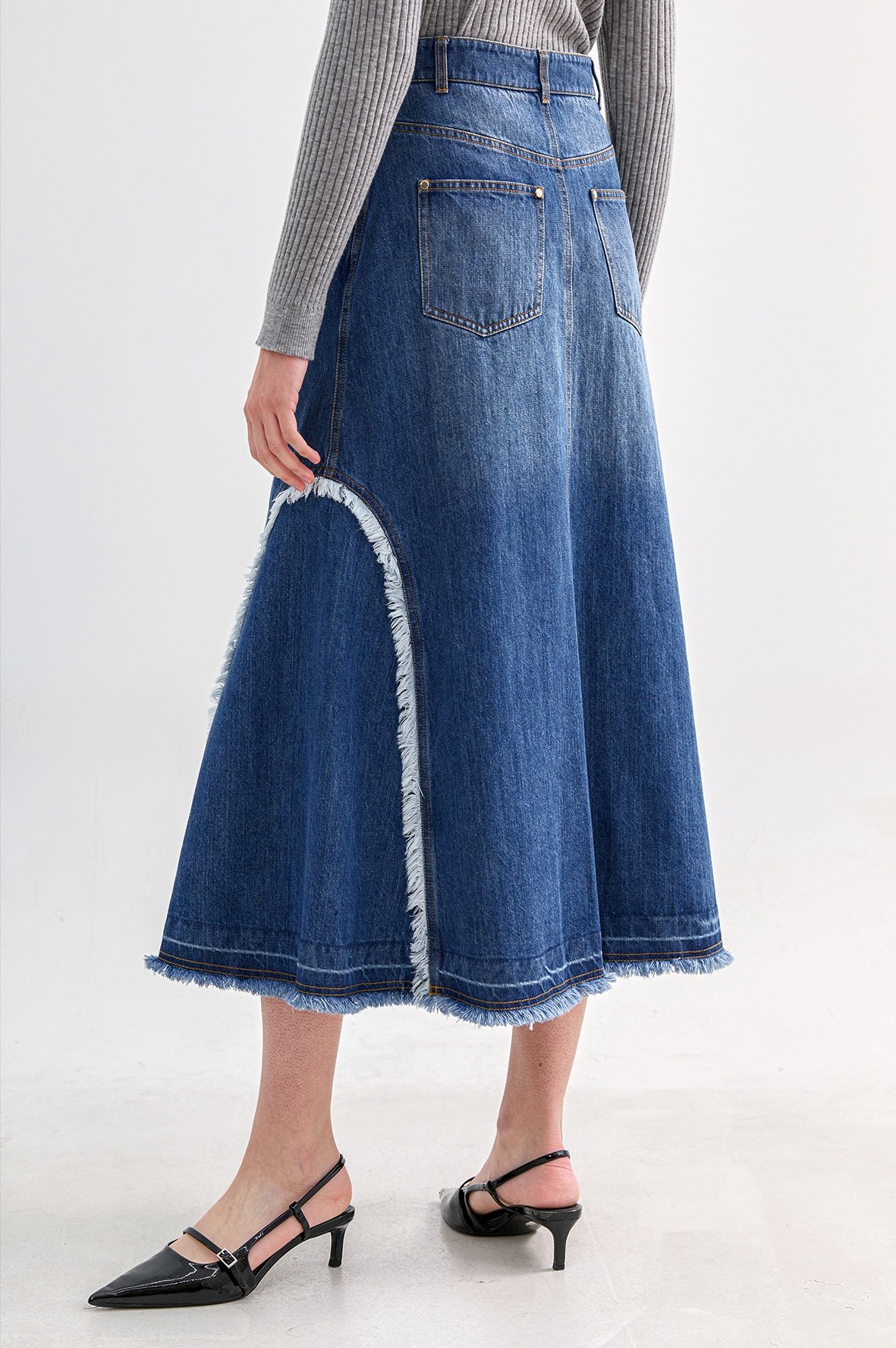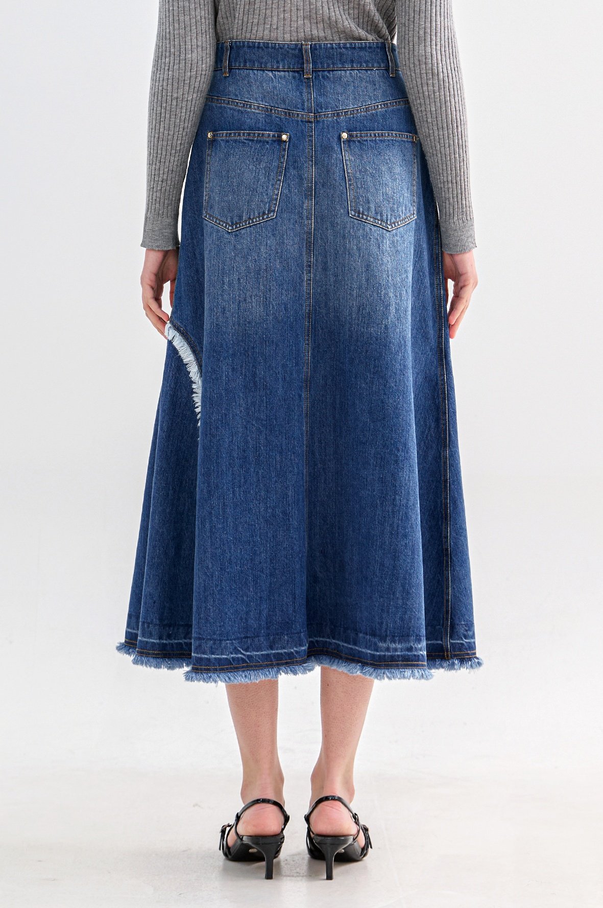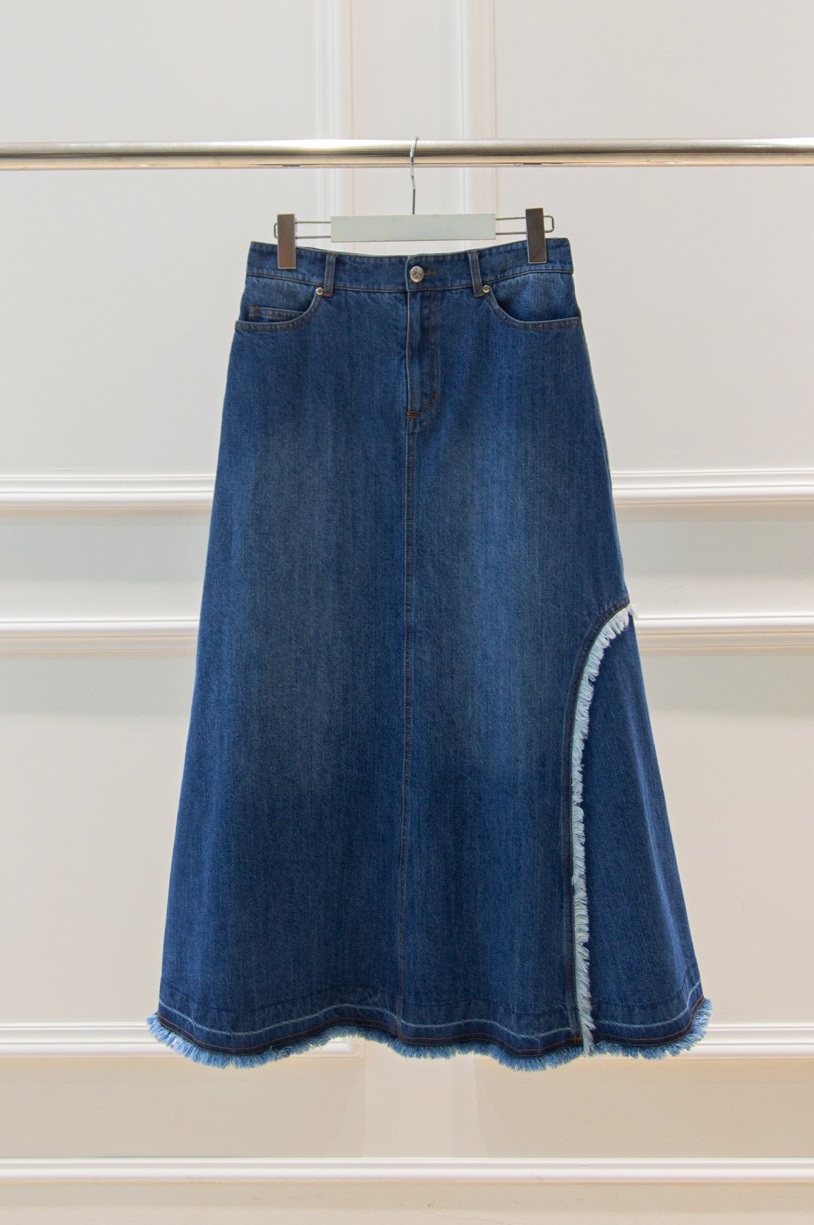 트렌디한 감성의 긴 길이감과 워싱된 데님에서 느껴지는 컬러감이 돋보이는 스커트로서 5개의 포켓이 있어 실용적입니다.