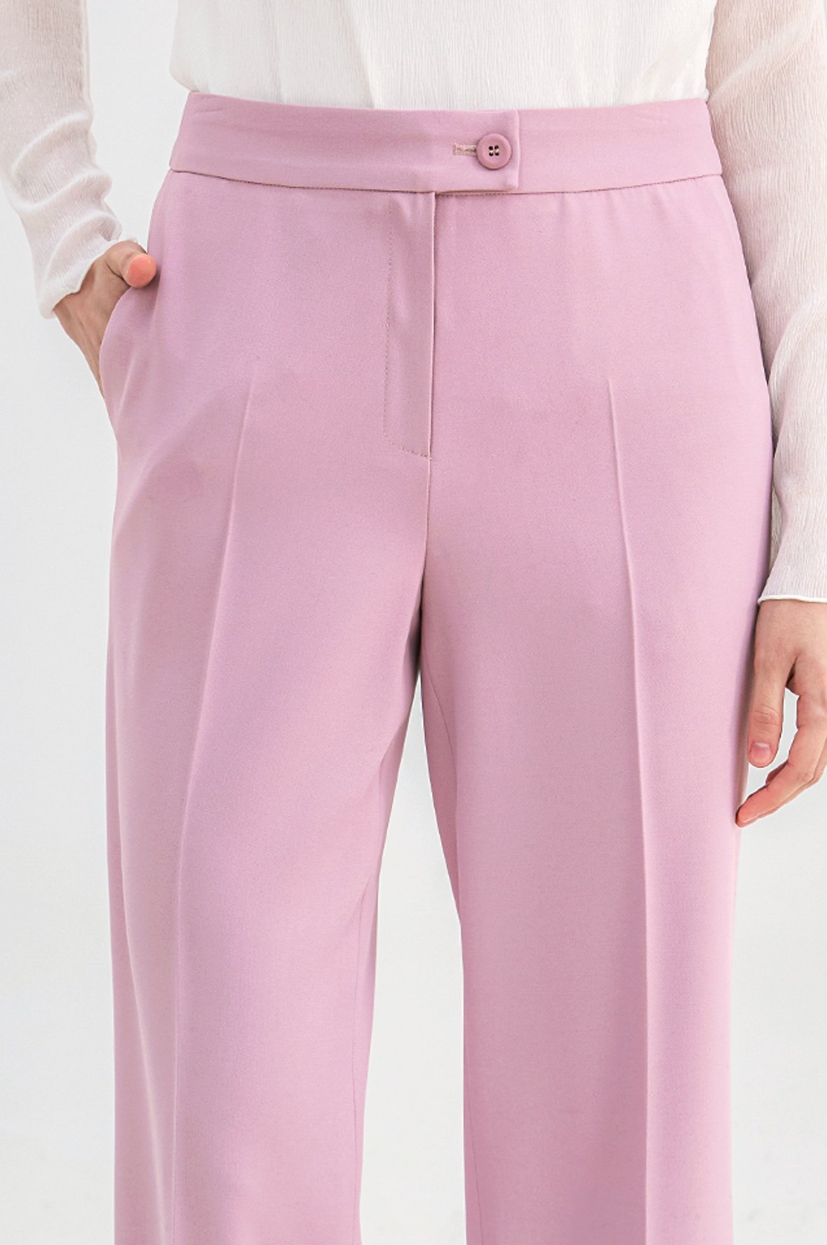 접은 주름 디테일은 다리 라인을 길어 보이게 연출해주며, 베이직한 라인의 팬츠로서 활용도가 좋습니다.