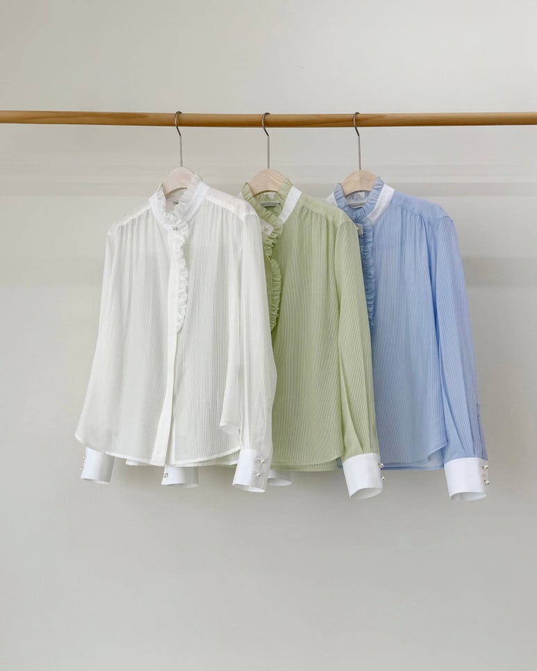 자연스럽게 연출되는 세련된 프릴 디테일과 카라 밴드 배색과 진주단추로 포인트를 더하였습니다.
