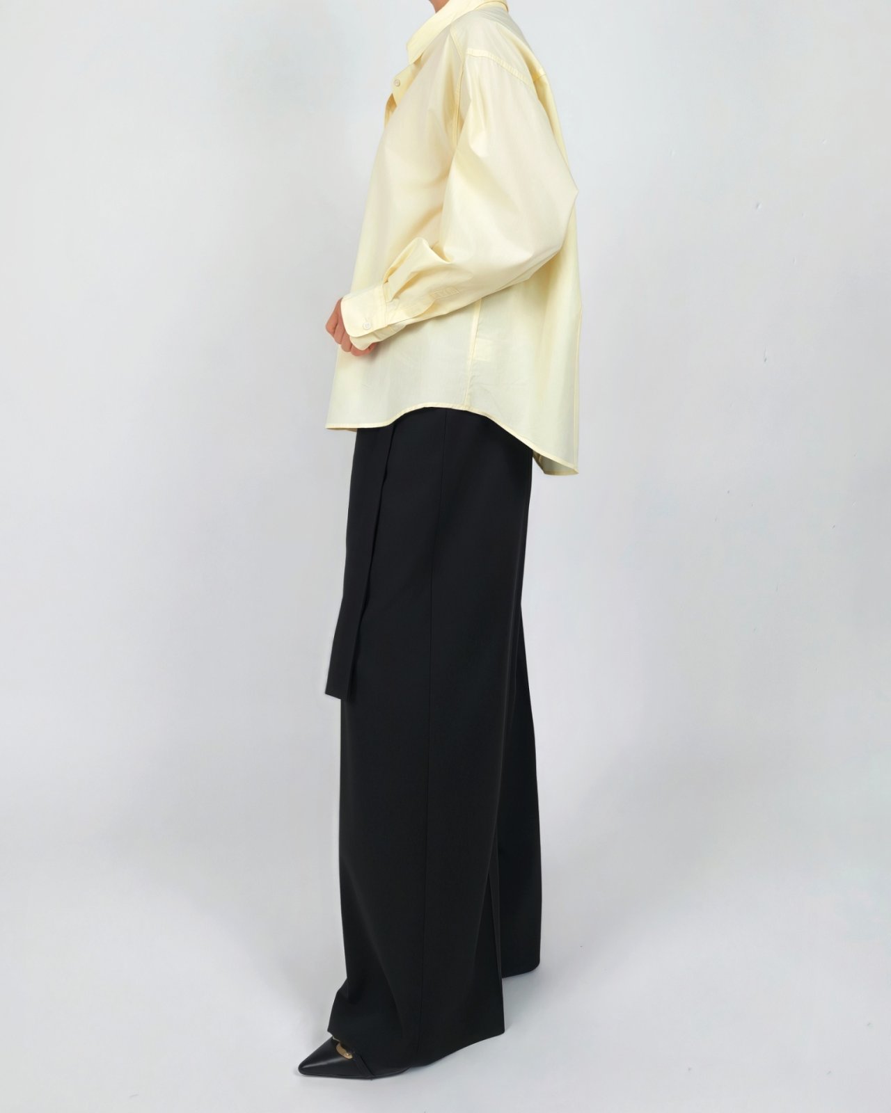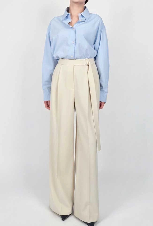 골드장식으로 포인트를 준 벨트 와이드 팬츠