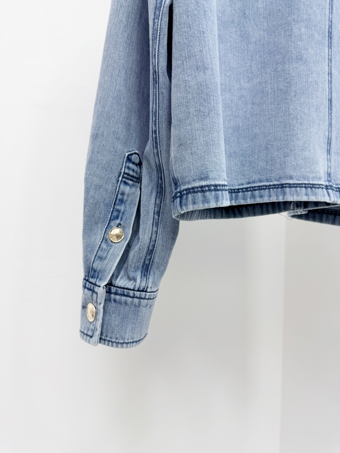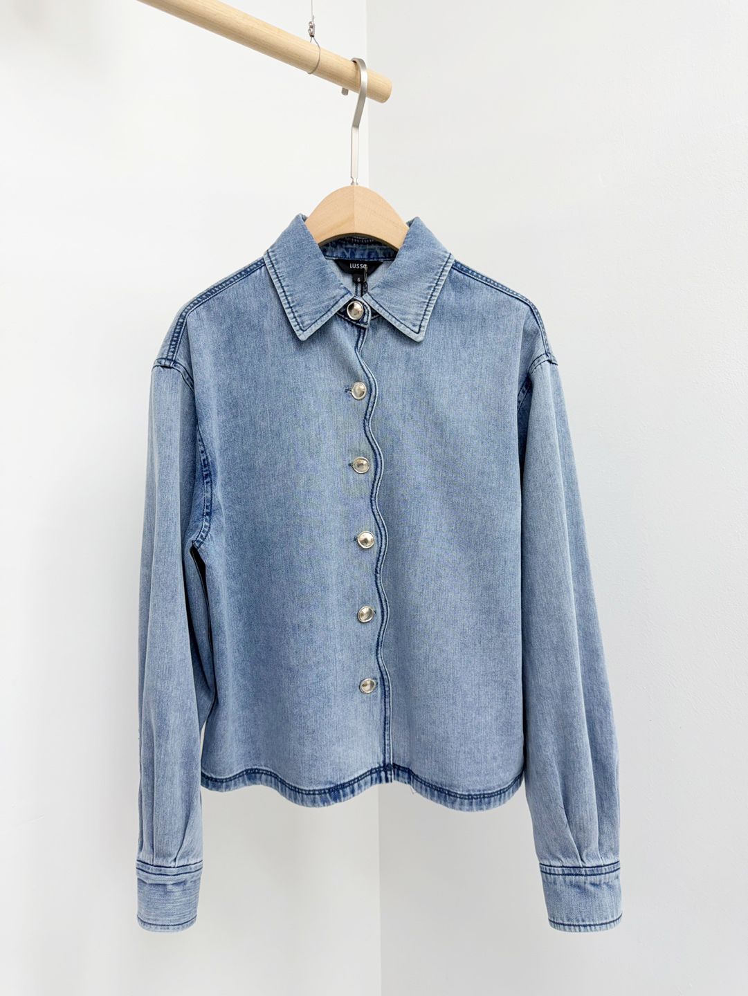 전면의 물결 모양 전정 라인과 고급스러운 금속 버튼이 자칫 투박할 수 있는 데님 소재에 여성스럽고 우아한 포인트를 더해줍니다.
