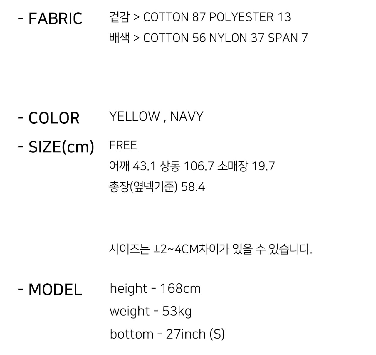 상품 리오더 시 원단의 탕(색상) 차이가 있을 수 있습니다