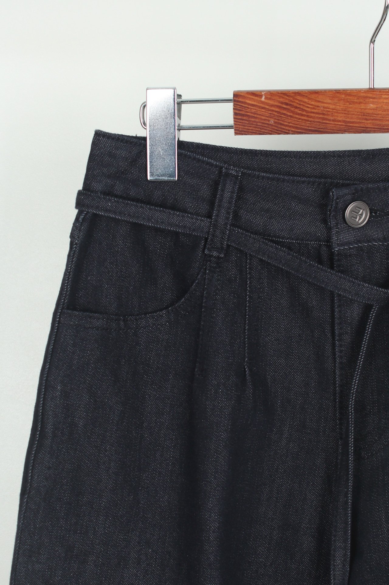 앞면에는 후크와 지퍼 클로징이 구성되어 착용이 간편하며, 허리 라인 양쪽에는 더블 다트 디테일이 더해져 허리부터 레그라인까지 자연스럽게 이어지는 실루엣이 형성됩니다.